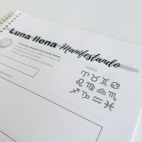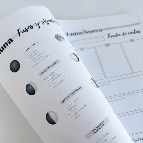 - Guías de preguntas y espacios para intencionar, reflexionar y observarte en cada fase lunar.
